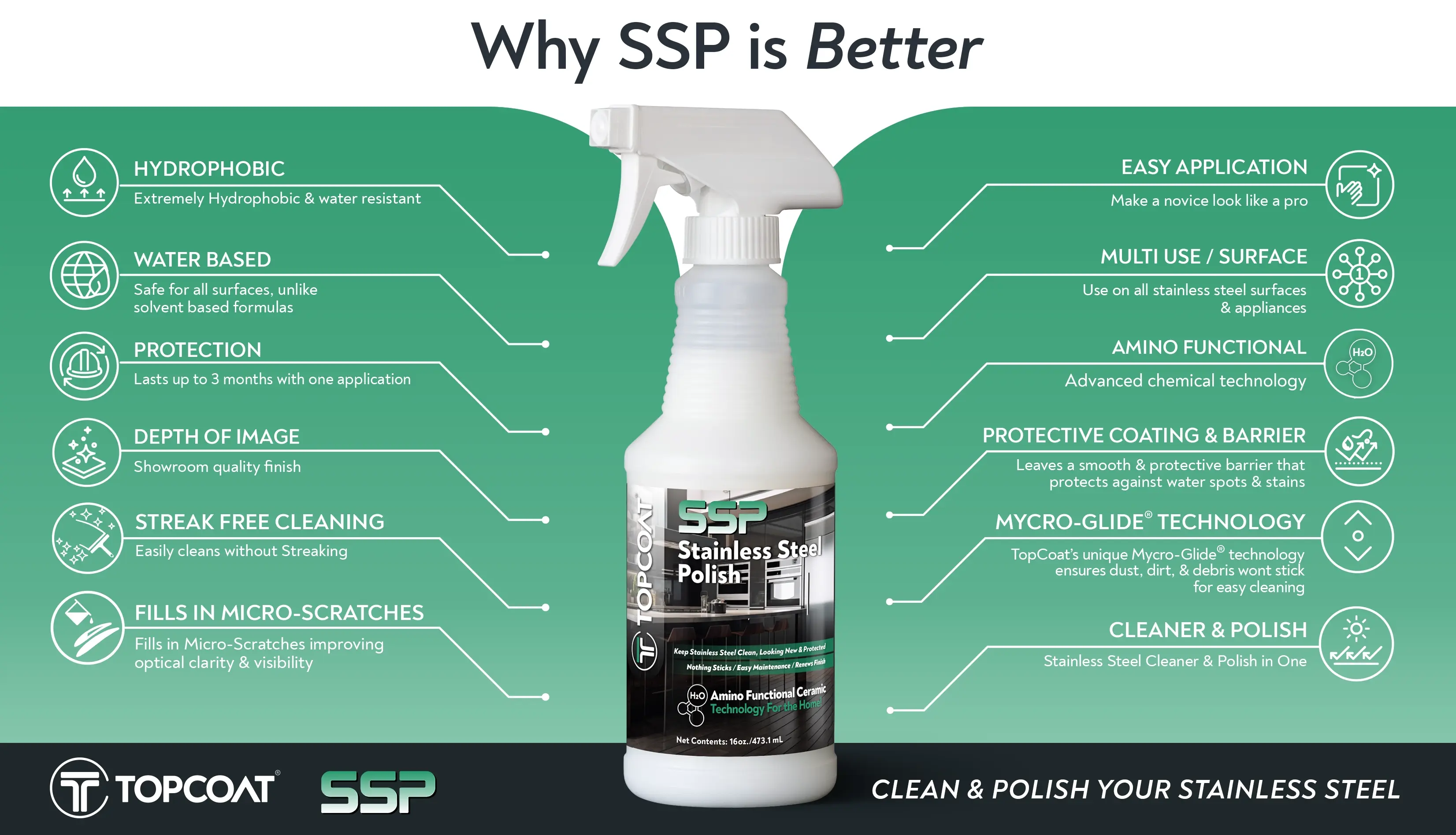 TopCoat® SSP invites you to a new era of stainless steel maintenance. With its superior formula, ease of use, and long-lasting protection, SSP is more than just a polish – it's a guardian for your stainless steel, ensuring it remains as stunning as the day you bought it.