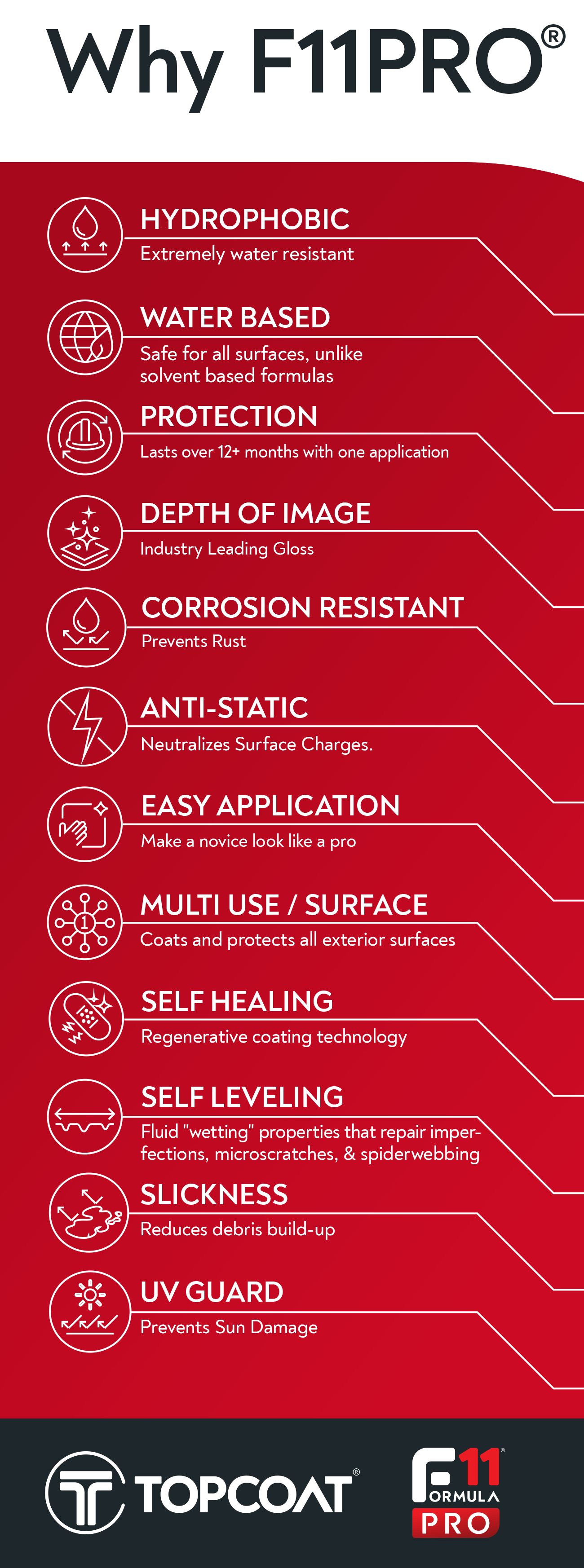 Discover why so many rate F11PRO #1 in the detailing industry, from knowledgeable customers who have tried them all, trusting F11PRO® as their all-in-one detailing solution for years. From UV control that prevent sun damage, corrosion inhibitors that stop rust and oxidation, anti-stat properties that neutralize charged dust and dirt particles so surfaces remain cleaner, or water-based formulations that are safer, non-flammable, and eco-conscious with self-leveling properties that create a satiny, sleek, & long-lasting protective barrier that renews every surface—interior or exterior.