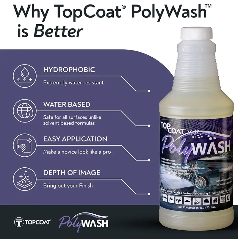 Unlike traditional soaps and washes, PolyWash™ will break up dirt and grime without damaging the surface. PolyWash™ is specially formulated to bond with all TopCoat® Sealers.