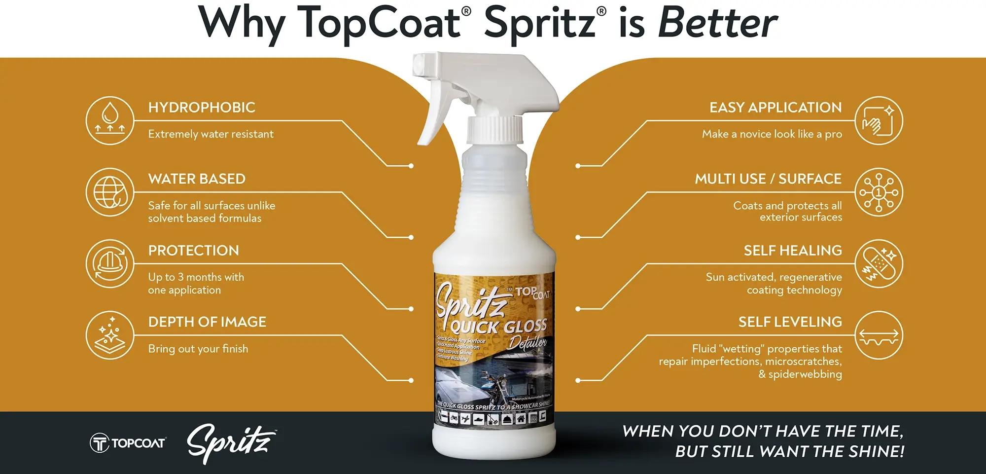 Spritz® is a quick and easy way to maintain, preserve, enhance, and extend the life of your vehicle surfaces and prtective coatings such as sealers or sealants. With an easy spray and wipe application maintaining your investment becomes effortless and quickly showcases a professional result in the matter of minutes.