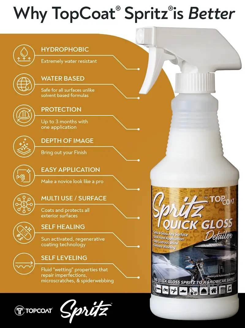 TopCoat® Spritzis a speed detailer and waterless wash in one, easily cleaning and renewing your vehicle without washing or need of water!  Spritzis easy to use, enhancing and renewing while providing protection from the elements.