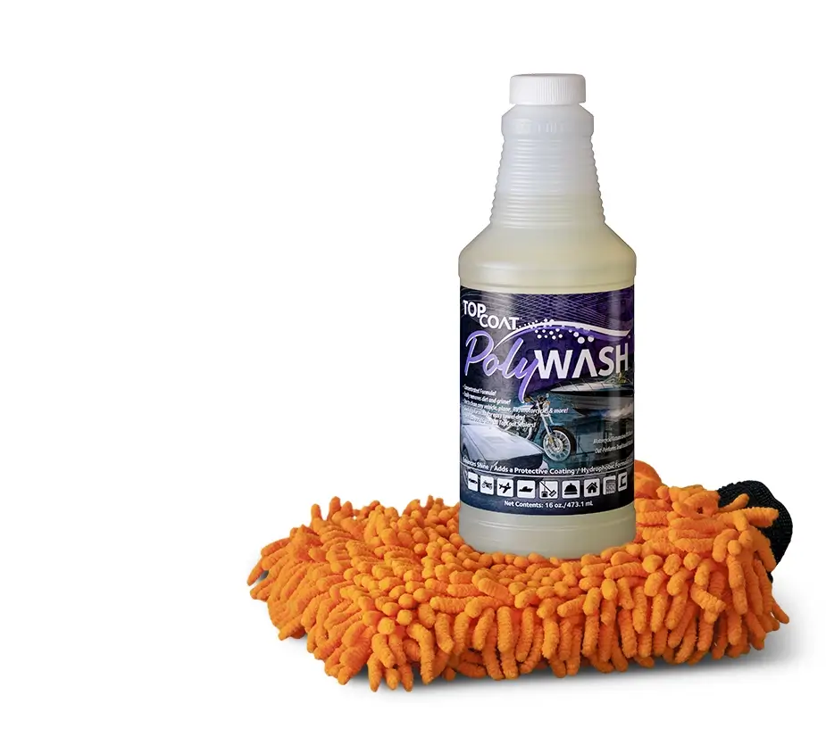 The perfect wash before applying any coating. Pour PolyWash® into a bucket then add water (Can also be used in foam cannons). Recommended 2 ounces of PolyWash® per gallon of water. Wet the vehicle you’re washing then apply using a TopCoat® Wash Mitt or Large Applicator Pad. Rinse thoroughly after washing, then dry using a TopCoat® Ginormous Drying Towel.