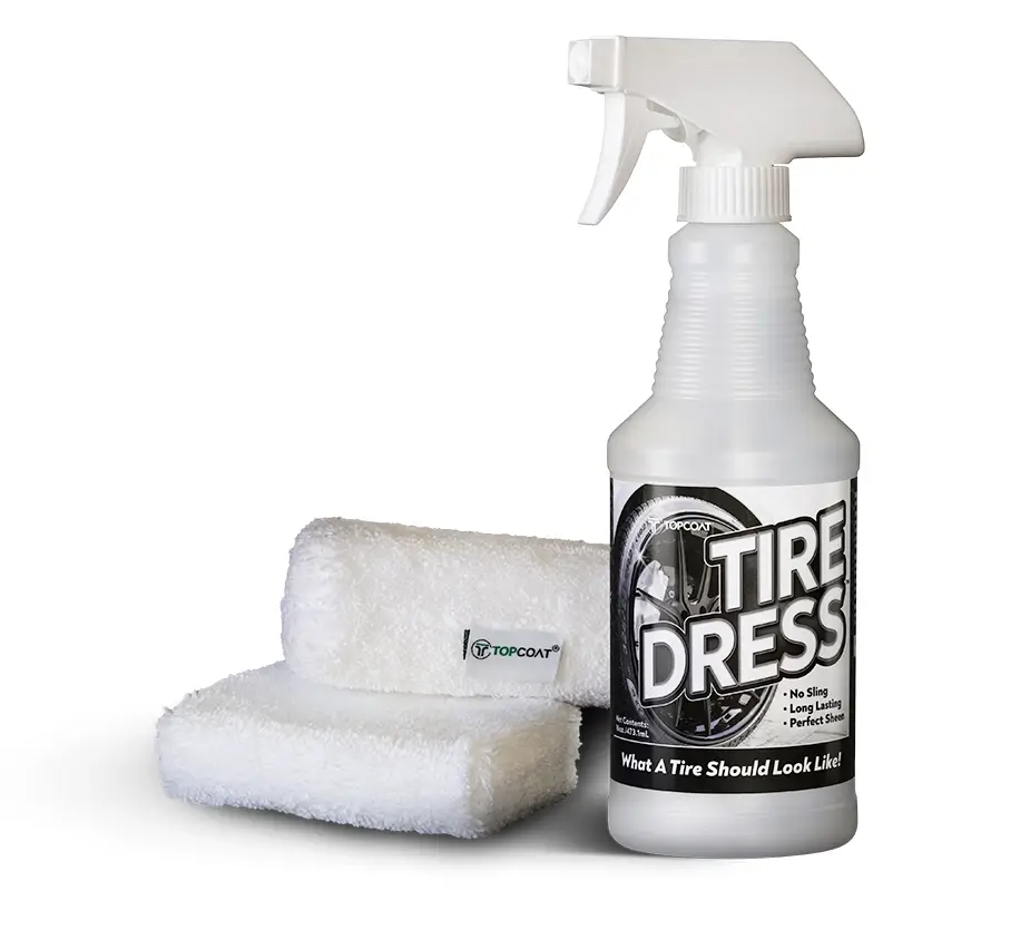 Spray TireDress® into an applicator pad until the pad is saturated with product. Press the saturated applicator pad directly to the tire, wiping evenly over the rubber until the entire tire is coated. Wipe or buff excessive dressing with a clean microfiber towel.